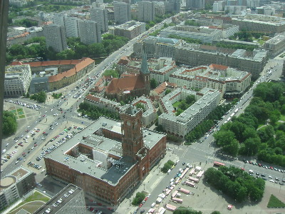 Blick vom Fernsehturm auf das Rote Rathaus und das Nikoleiviertel.