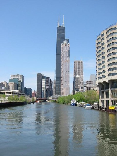 Blick vom Chicago River auf den Sears Tower. Höhe mit Antenne: 527,3 m