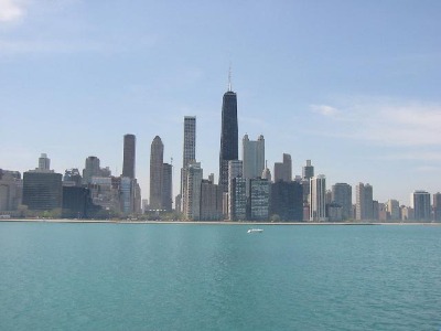 Skyline von Chicago, in der Mitte der John Hancock Tower. Höhe ohne Antenne: 343,5 m.
