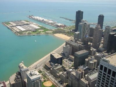 Blick vom John Hancock Tower auf den Michigansee und Navy Pier.